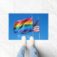 Un luminoso felpudo con una bandera del Orgullo Arcoiris ondulada junto con una bandera estadounidense, colocado contra un cielo azul perfecto. Celebrando una América y un hogar acogedores y diversos. Fotografiado en Cherry Grove en Fire Island. Parte de la colección Orgullo.
