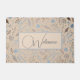 En esta elegante alfombra de la puerta se respira una luz tamizada, con hojas y flores en tonos azules y tostados, donde en el centro hay una plaza donde se puede personalizar la alfombra de la puerta con el nombre familiar o de la bienvenida, o cualquier frase o logotipo para hacerlo único.
