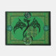 Dragón negro tribal con nudos celtas verdes trabajando alas. Los tonos de nudo verde y celta funcionan detrás y alrededor del dragón y del trébol de cuatro hojas.