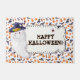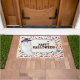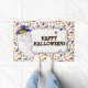 Alfombra de Halloween festiva con un fantasma sonriente con sombrero de bruja y un mensaje en negrita que dice “¡Feliz Halloween!”. Rodeado de un borde caprichoso de calabazas, murciélagos y hojas de otoño, este diseño divertido es un acento divertido de temporada para porches, entradas o espacios de fiesta. Una forma alegre de saludar a los niños que piden dulces y a los invitados.