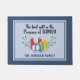 Anillo en temporada de vacaciones con este felpudo de personalizable que presenta un simple ilustracion de regalos navideños envueltos en fiestas, adornados con arcos coloridos y acentuados con nieve y vegetación suavemente cayendo. La elegante tipografía de escritura ofrece un sentido mensaje de vacaciones que dice: "El mejor regalo es la presencia de la familia". Personalice este diseño agregando su nombre familiar para crear un cálido saludo para la familia y los huéspedes. También hace un regalo para los nuevos propietarios.