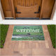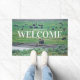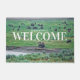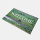 Fotografía de un rebaño de Bison pastoreando, descansando y socializando cerca de un río en la zona del valle de Lamar, ubicado en el Parque Nacional Yellowstone. El texto en blanco de este felpudo dice: "Bienvenida a los cascos limpios". Derechos reservados ©2018 Kimberly J Tilley.