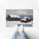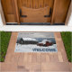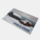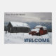 Escena rural, invernal, con un camión rojo, ruinoso, con nieve, sentado cerca de una cabaña destartalada cerca de Sandpoint, ID. El texto de personalizable que dice "BIENVENIDA" aparece y hay un lugar adicional para que usted añada su propio texto.