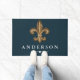 En el centro se encuentra la bonita fachada de hierro forjado dorado. Fondo azul marino oscuro con texto de nombre familiar personalizado. Este felpudo es un lugar refinado que causaría una gran impresión a los clientes de su casa ya que son bienvenidos a su casa.