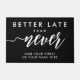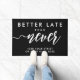 Saluda a tus invitados con humor y estilo usando este divertido Doormat de bienvenida. Con un moderno guion blanco sobre un elegante fondo negro, el divertido mensaje "Mejor tarde que nunca" le da un giro divertido a cualquier entrada. Este manual de personalizable le permite personalizarlo con su propio texto, como su dirección o cualquier mensaje que desee mostrar. Perfecto para añadir un toque único y acogedor a la decoración de su casa, creando un ambiente acogedor. Esta alfombra de bienvenida personalizada es una forma práctica y elegante de recibir a los visitantes, un regalo ideal para las familias o para cualquier ocasión.