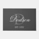 Elegante Doormat blanco grisáceo Monograma establecido Diseñado con fondo gris oscuro personalizable y monograma gris claro inicial en el centro. Personalizado con el apellido de la pareja en la elegante escritura de caligrafía blanca y año establecido en números blancos en el centro inferior. Hace un gran regalo de bienvenida o de ducha de novia.
