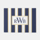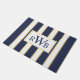 Añada un toque de elegancia a su entrada principal con este tapete de monograma de rayas personalizados. El diseño es sencillo, con rayas azules y blancas con acentos dorados. Personalizar con un monograma de tres letras en una tipografía azul tradicional