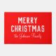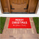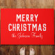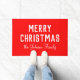 Un doormat de Navidades clásicos con un color rojo vibrante. Con un texto blanco y negrita que dice "Feliz Navidad" junto con un nombre o apellido escrito a mano personalizado del destinatario, lo que lo convierte en un toque reflexivo y único para los regalos navideños.