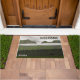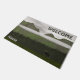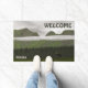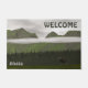Una pintura digital "primitiva" o folclórica de árboles de coníferas verdes y montañas en Alaska en un día muy gris y nublado. Un alce de toro (Alces alces) en primer plano da escala a la escena. Hay dos ejemplos de personalizables que dicen "Alaska" y "BIENVENIDA".