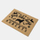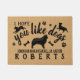 "Espero que te gusten los perros" texto con 3 siluetas de perro pastor australiano, huesos, huellas de pata y el nombre de tu familia - fondo falso de burrega con texto negro - el felpudo perfecto para los amantes del perro