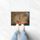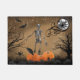 Esqueleto bailando en un jardín de calabaza. Luna de púas con murciélagos, araña y un cuervo sentado sobre una calabaza.