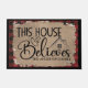 Este moderno doormat de una casa de campo muestra la proclamación cristiana "Esta Casa Cree" en un fondo de arpillera de aspecto desgastado enmarcado por un patrón de manto de búfalo rojo y negro. La falsa apariencia angustiada está enmarcada por un borde negro y el diseño interior incluye una azotea y una cruz cristiana con detalles del corazón. Agregue su nombre familiar o texto personalizado para hacer que este felpudo sea el único suyo. Pida hoy mismo o para regalar como regalo especial.