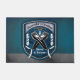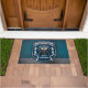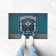 Cree una estera pasada de moda personal de la entrada del afeitado y del corte de pelo de la barbería del monograma. Polos icónicos de los peluqueros de las características del diseño, maquinillas de afeitar, máquinas de afeitar, cepillo y bigote hermoso.