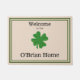 El felpudo irlandés de encargo de la familia con una estera de puerta del trébol ofrece una imagen del trébol famoso y bien en el centro reconocido del trébol de cuatro hojas de la estera. El saludo "recepción a" se imprime cerca del top de la estera y el apellido se imprime cerca de la parte inferior de la estera sobre el apellido se imprime en la escritura intrépida y elegante debajo de la imagen del trébol. El color de fondo de la estera de puerta es una sombra beige caliente y la imagen en la estera se enmarca con dos rectángulos negros.