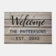 Una perfecta madera rústica linda y personalizado para su familia. "¡Bienvenidos!" (en un guión moderno), su apellido y "EST." más el año establecido se imprimen contra una foto de listones de madera tibia. Perfecto para su casa de campo, casa de campo, casa de playa, pensión o casa de campo.