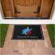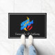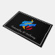 Feliz campistas RV o alfombra de puerta de cabaña, tipografía azul con un gráfico de fogata sobre fondo negro. Simplemente personalizarla con cualquier nombre usando el botón "personalizar".