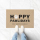 Un doormat festivo y divertido para los amantes de las mascotas presenta la moderna redacción con temática de perro "Happy Pawlidays". Personalice el texto del personalizado con el apellido de su familia. Las impresiones de la pata corta acentúan la redacción de estilo manuscrito. Incluye un fondo rústico neutro con texturas toscanas.