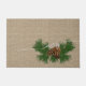 Hermoso patrón de tejido textil de hilo jute burlap de color beige taupe con imagen estacional de conos y agujas de pino, y un clásico y divertido deseo de bienvenida de Merry. En diciembre se diseñó la temporada para el decorador de interiores o para los amantes del estilo rústico de las cabañas que disfrutan de las vacaciones de invierno y Navidad. Los productos originales y modernos para los amantes de la decoración del porche, el patio o los asientos en el patio trasero son de su casa, cabaña de troncos, cabaña, lago o casa de vacaciones en el río.