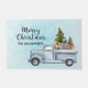 Doormat de bienvenida con un diseño festivo. Camión con Navidades de pinos junto con algunos animales de bosque. Un oso, un zorro y un ciervo parados en la parte de atrás yendo a dar un paseo. Diseño creado con acuarelas. El texto dice Feliz Navidad con tu nombre personalizado.