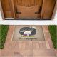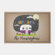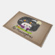 Vitral de caravanas moradas y blancas decorado para Halloween con araña, telaraña, maíz dulce, gato negro, flamencos de esqueleto, lápida, gato negro y linterna debajo de un cielo con estrellas, luna llena y murciélagos. El texto dice: "Campistas felices"