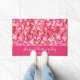 Cute Happy Valentine Day Doormat con un patrón de corazón rojo rosado y un bloque de color rosado en la parte inferior con "Happy Valentine Day" y el apellido. Personaliza con tu apellido o texto.