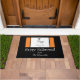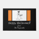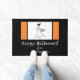 Una alfombrilla de Halloween que es linda, divertida y un poco espeluznante. Fondo negro con naranja y blanco. Un gráfico de fantasma y gato negro con la palabra "Boo". En dos fuentes (una fuente divertida y una escritura) están las palabras "Feliz Halloween de <Custom Family Name>!" ¡Clásico, elegante y divertido!