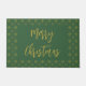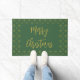 Este oscuro felpudo verde dice Feliz Navidad en un elegante guión de oro falso (no de Relieve metalizado). Un patrón de oro falso festivo forma la frontera.