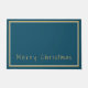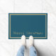 Doormat mostrado con un fondo azul verde azulado, bordes de color plateado y dorado alrededor del felpudo y frase de "Feliz Navidad" en un texto optimista de color dorado cerca del fondo del felpudo.