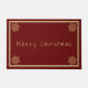 Doormat mostrado con un fondo burdeos rojo profundo, bordes de color plateado y dorado alrededor del felpudo y frase de "Feliz Navidad" en un texto optimista de color dorado cerca del fondo del doormat y cuatro copos de nieve de color dorado .