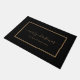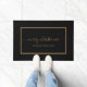 Elegante felpudo Feliz Navidad con un guion dorado en un fondo negro. Personaliza con tu apellido o texto.