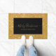 Elegante felpudo Feliz Navidad con un guión dorado en un fondo negro adornado con un fondo de purpurina dorado. Personaliza con tu apellido o texto.