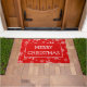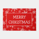Este felpudo presenta un saludo de personalizable, que actualmente lee "Feliz Navidad" con un rectángulo rojo recortado en blanco sobre un fondo rojo cubierto con varios copos de nieve de tamaño. ¡Cambie fácilmente el saludo a "Saludos de temporada" o cualquier otra palabra de tamaño similar en la página del producto!
