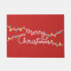 Luces navideñas festivas Feliz alfombra de la puerta de Navidad puesta en un fondo rojo. Visite nuestra tienda para ver una gran variedad de esteras únicas de puertas.