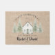Cozy neutral doormat with a burlap-look background, watercolor cottage and sage pines, and curved “First Christmas At” text. Customize the address, names, and year—perfect for new homeowners and holiday housewarmings.