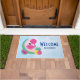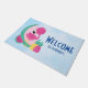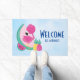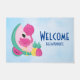 Un portero de bienvenida con tu nombre personalizado. Ilustracion agudo de un flamingo rosa con algunas sandías y piñas. Color rosa y verde. Summery y tropical. El fondo es una imagen de color azul claro.