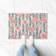 Un felpudo con un hermoso patrón de flores rosadas de bonito sobre un patrón a rayas compuesto de rayas azules y cremas.