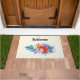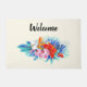 Estera de puerta de bienvenida con un vibrante y hermoso ramo de flores tropicales. Orquídeas, hibiscos y hojas tropicales. Color rosa, turquesa, rojo y azul.