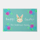 Personaliza tu porche delantero para Pascua! Este doormat de primavera presenta una linda mano personalizado ilustrada conejo conejito con una linda y moderna corona floral. A ambos lados del conejo están las palabras "Pascua feliz". El nombre de tu familia está debajo de un lindo texto blanco.
