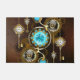 Lentes turquesa con un reloj de antigüedades con engranajes de latón y llaves doradas sobre un fondo oxidado y marrón. Estilo Steampunk.
