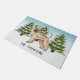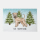 El original ilustracion personalizado de Destei de un lindo perro de la raza de Wheaten Terrier recubierto suave. El perro es colocado en una escena invernal con tres abetos verdes y la caída de la nieve. El fondo es un degradado de azul a blanco que da al diseño ese aspecto frío del invierno. También hay un área de texto personalizable para un nombre.