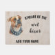 Cuidada y divertida, ten cuidado con el besador mojado" tapete de puerta de bulldog ameriucano colocado sobre un fondo de textura de madera. Este producto puede ser personalizado a su gusto.