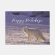 Hermoso y lindo zorro blanco ártico en la nieve con el texto "Felices Fiestas". Puede personalizar del texto o simplemente eliminarlo.