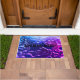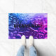 Fotografía abstracta en color de charcos de agua en una alfombra de bienvenida con la palabra francesa para bienvenida, Bienvenue