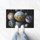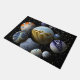 Planetas fractales hermosamente diseñados rodeados de estrellas suspendidas en el espacio, en los principales colores de oro y azul.