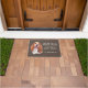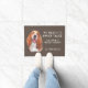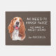 "No hay necesidad de llamar dos veces, tenemos una hebilla de Basset" declara esta linda alfombra de puerta. El texto está en blanco en el lado derecho, mientras que a la izquierda hay una adorable imagen de un ataúd marrón y blanco. Todo está colocado sobre un fondo marrón gris.