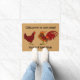 Una gallina y un gallo coloridos adornan esta estera de puerta de la diversión que diga, "recepción a nuestro gallinero."