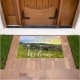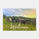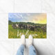 Este doormat de bienvenida cuenta con una hilera de bovinos de Speckle Park blancos y negros, parados detrás de una valla de alambre de púas con malezas amarillas brillantes en primer plano y un cielo gris parcialmente turbulento mezclado con el sol que se pone detrás.