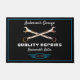 Cualquier garaje de nombre con gráfico de brujas en un fondo negro con un borde azul. Simplemente utilice la opción "personalizar esta plantilla" para cambiar el texto. Guión eslogan con cualquier fecha. Solo elige el tamaño.