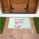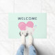 Estera de puertas de bienvenida con un adorable ilustracion gráfico. Un gato blanco gatito con una linda imagen impresa en su piel. Dormir pacíficamente. Un gran corazón rosado detrás de ella y algunas pequeñas estrellas también. Fondo verde suave.