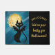 ¡Un verdadero felpudo de Halloween para saludar a la familia, a los amigos y a los trucos o tratantes! ¡Este muestra a un gato negro que es porfiado por Halloween sentado frente a una luna llena brillante (con flores)!